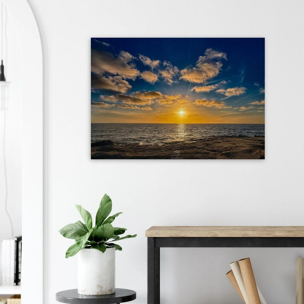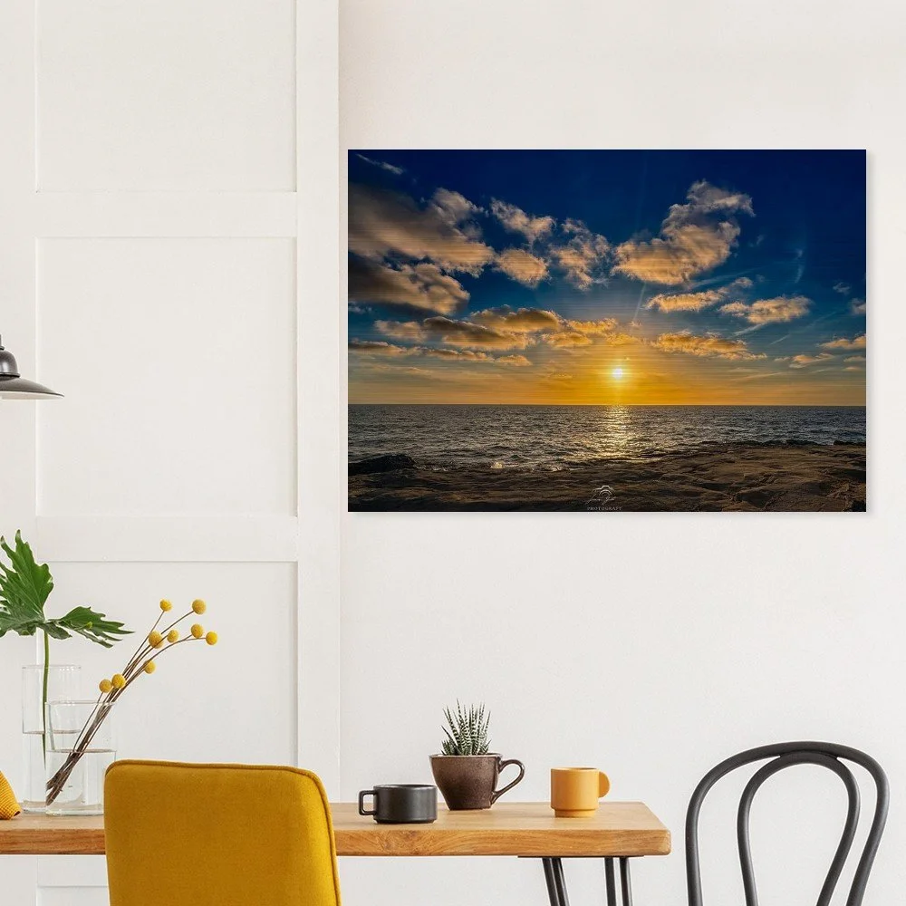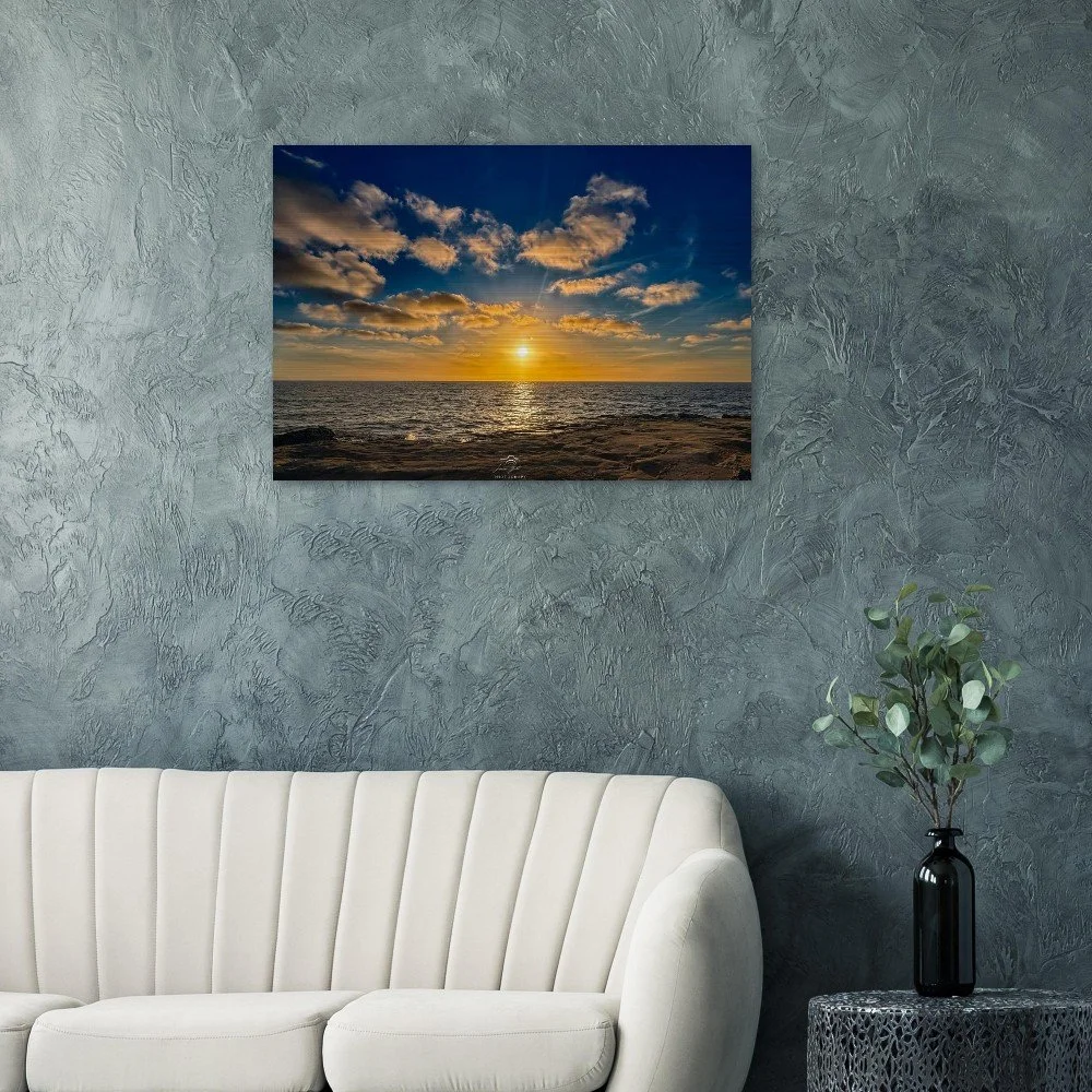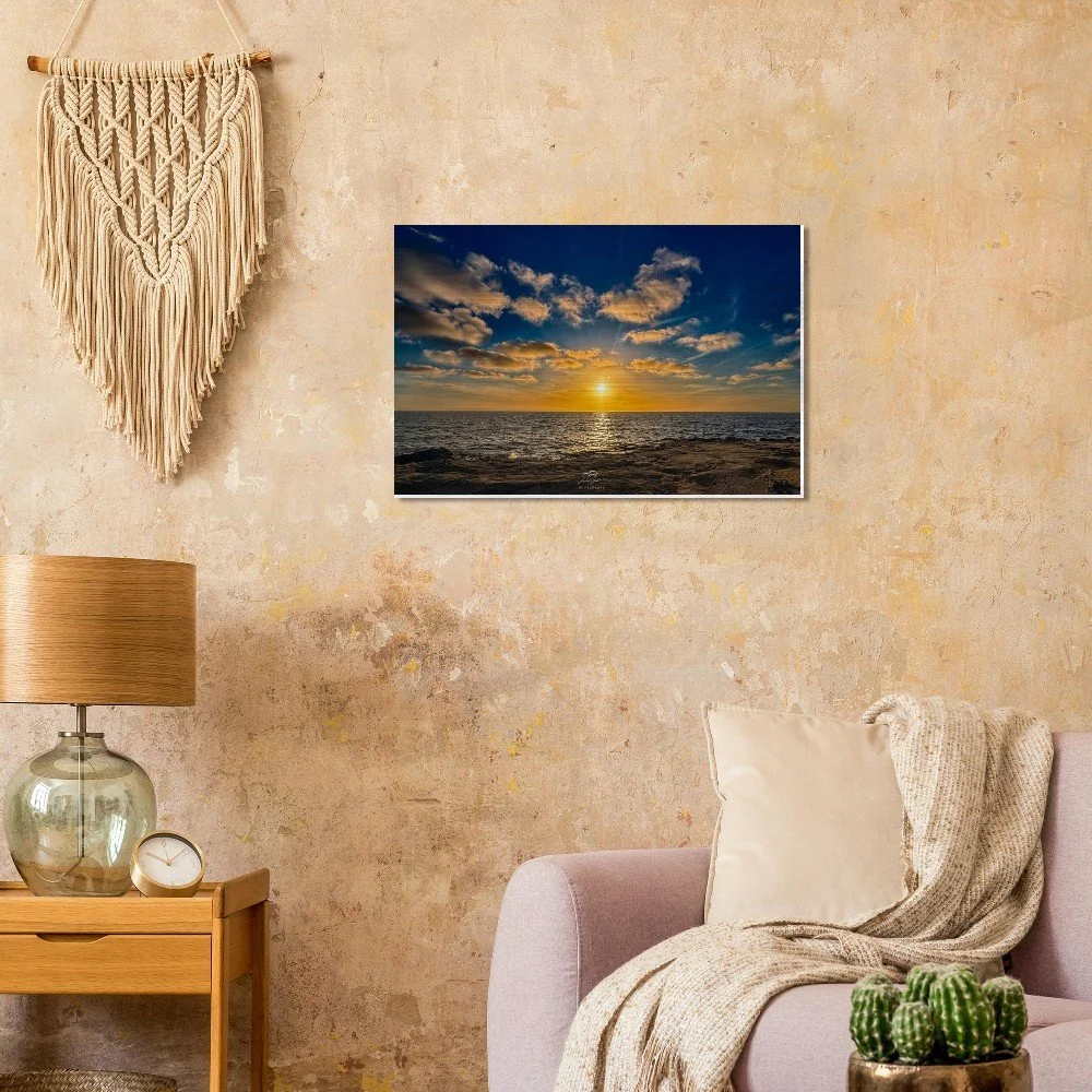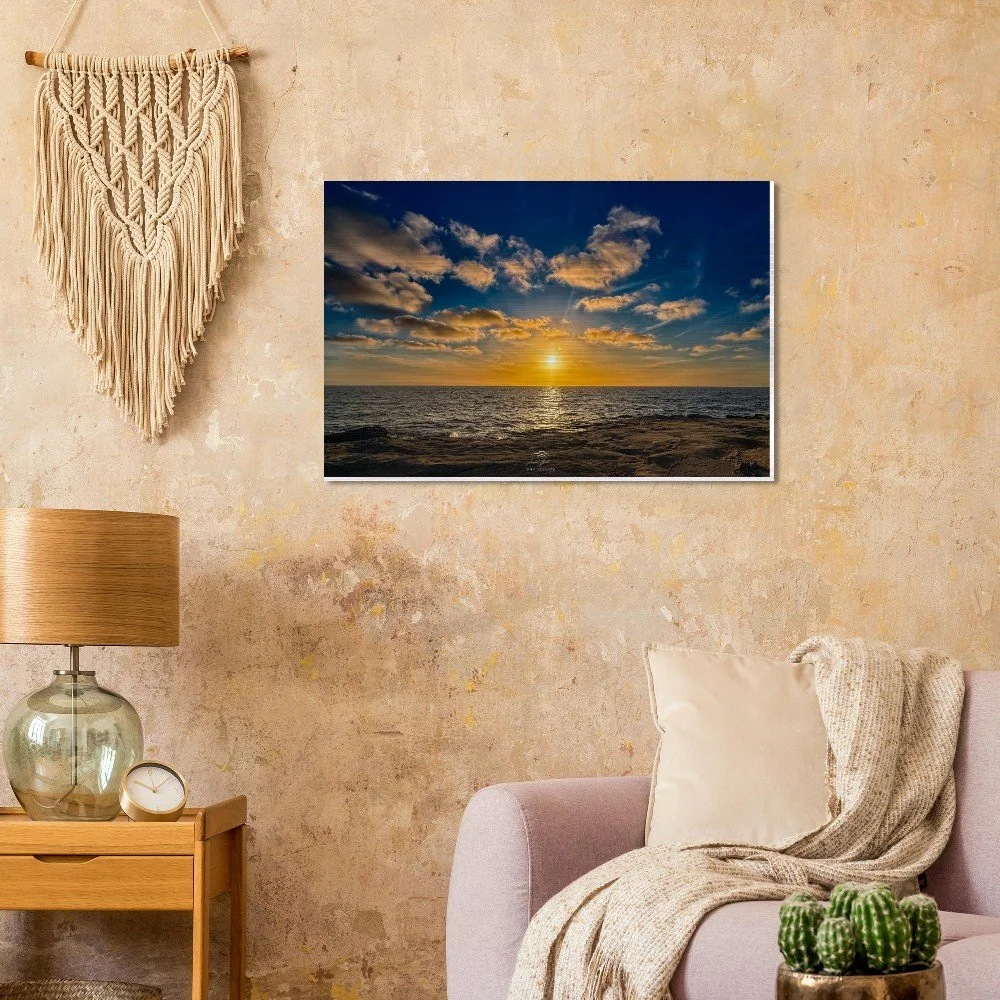 Printed on high-quality brushed aluminum, this artwork delivers a sleek, modern finish that enhances color depth, contrast, and detail. The metallic surface interacts with light to produce a subtle shimmer, bringing the sunset to life and adding a dynamic, gallery-quality presence to any room.