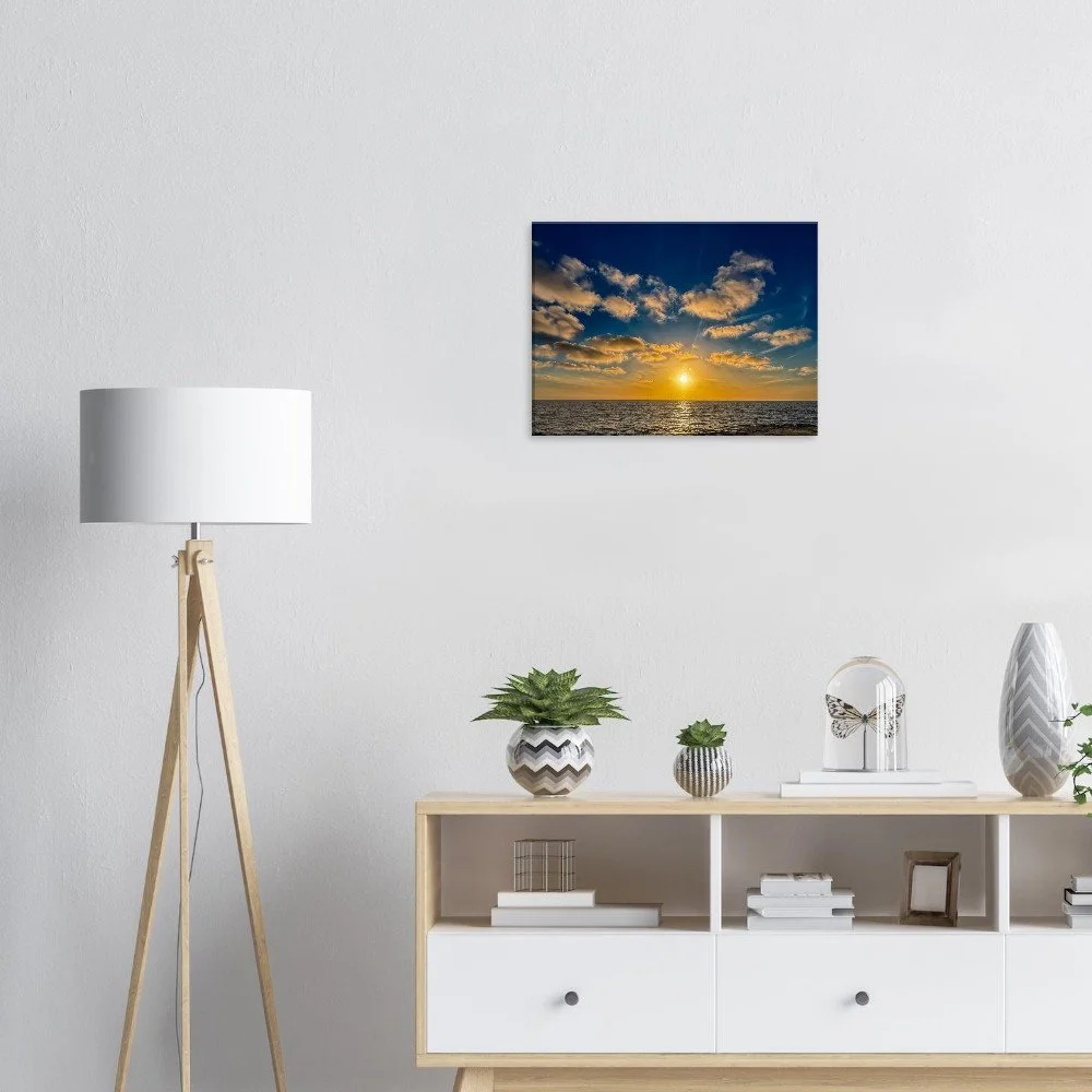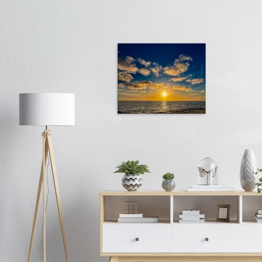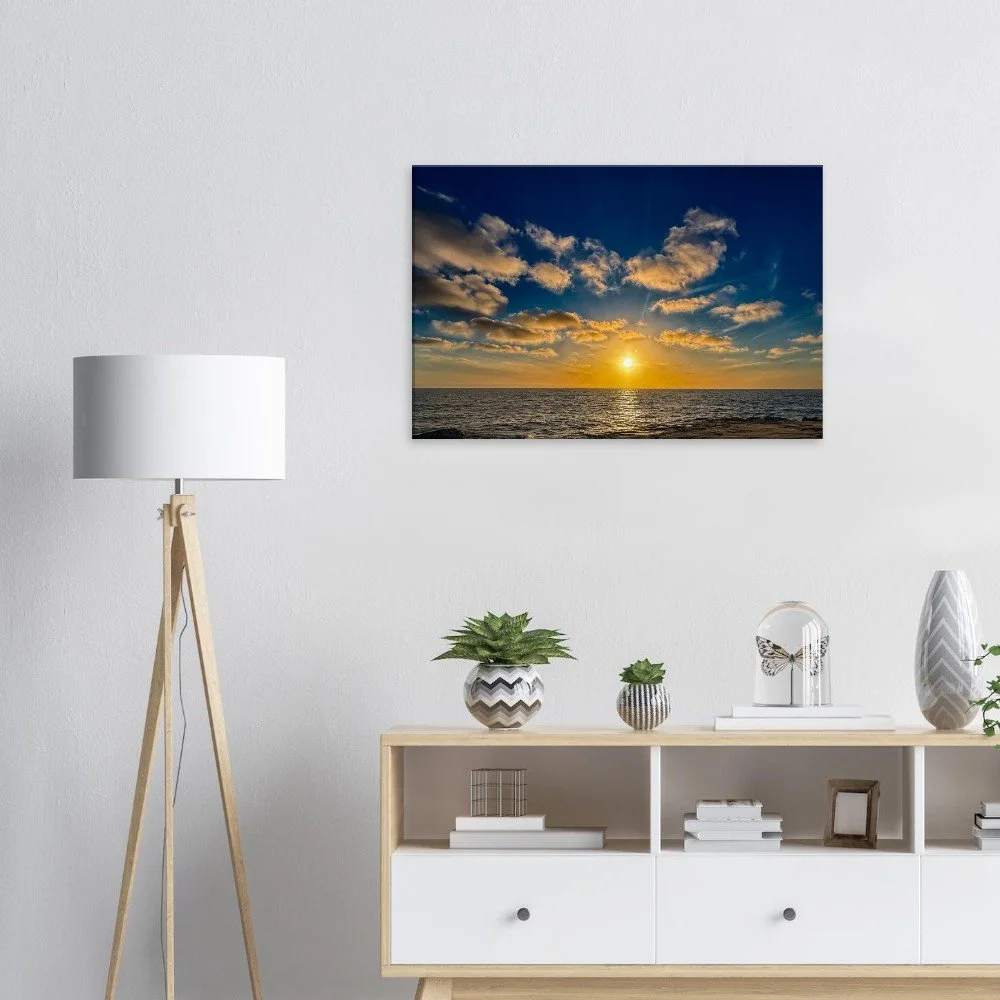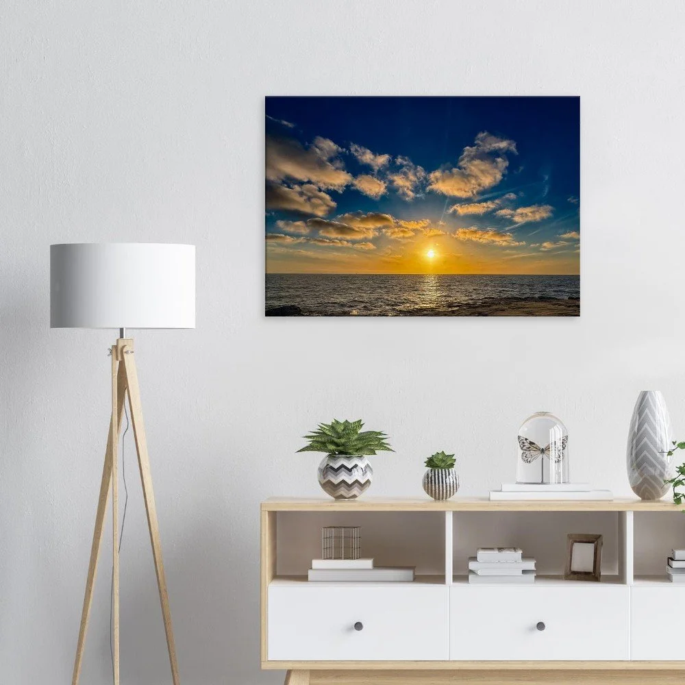 The dramatic contrast between the glowing sky and the darkened cliffs creates a captivating visual balance, bringing both energy and calm into your space. Whether displayed in a living room, bedroom, office, or beach house, this piece adds warmth, color, and a relaxed coastal vibe.