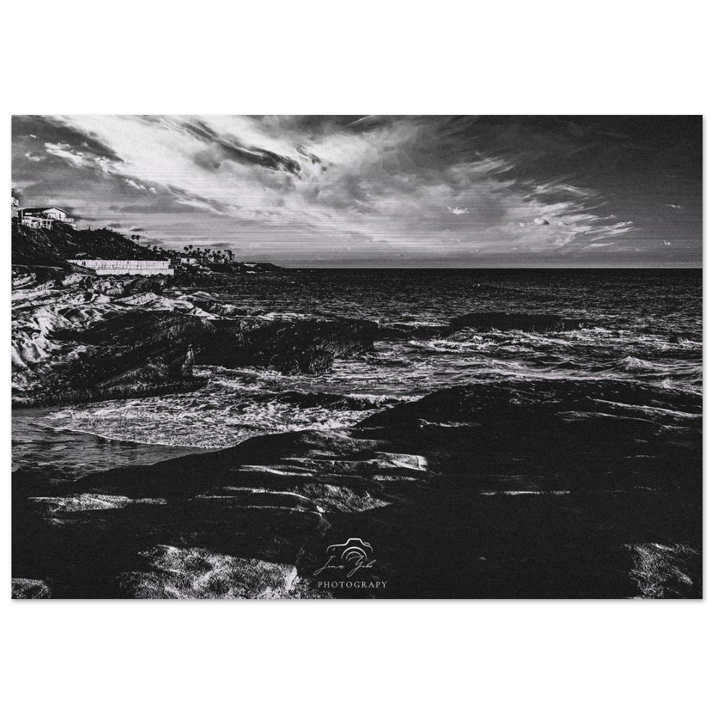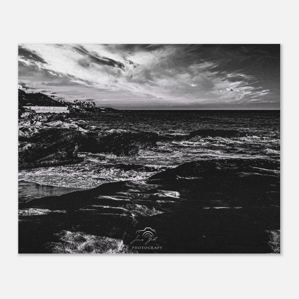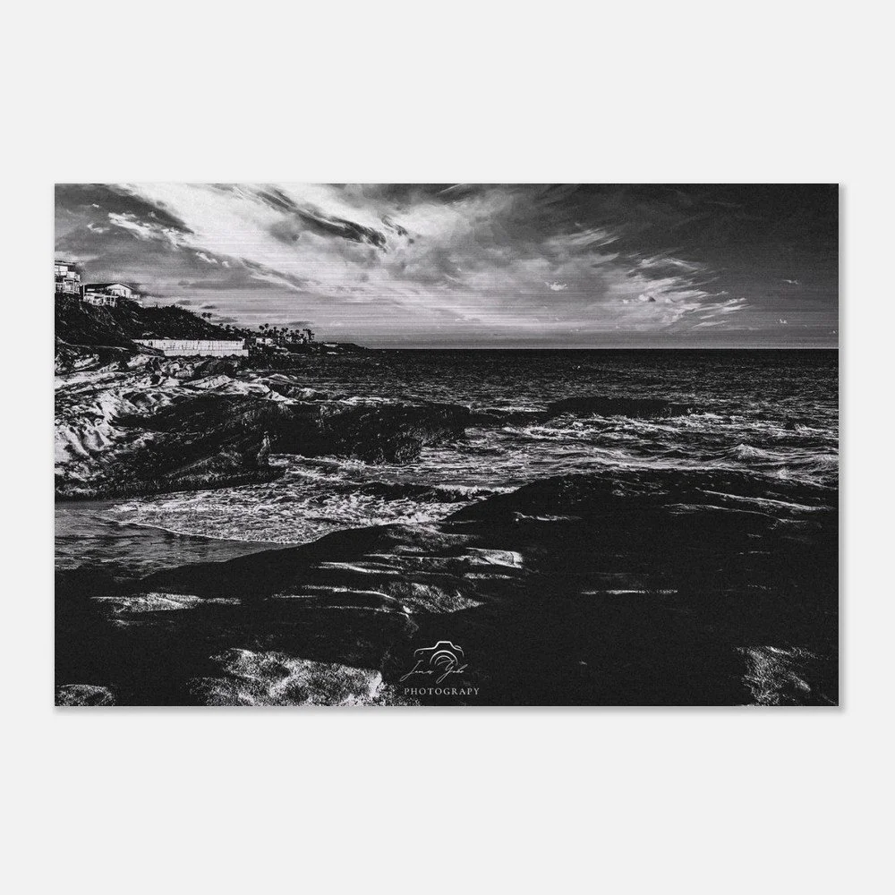 Elevate your space with timeless coastal elegance through this classic black & white Ocean Beach brushed metal print. Stripped of color, the image focuses on striking contrast, texture, and composition—highlighting the movement of the waves, the depth of the shoreline, and the dramatic interplay of light and shadow along the coast.