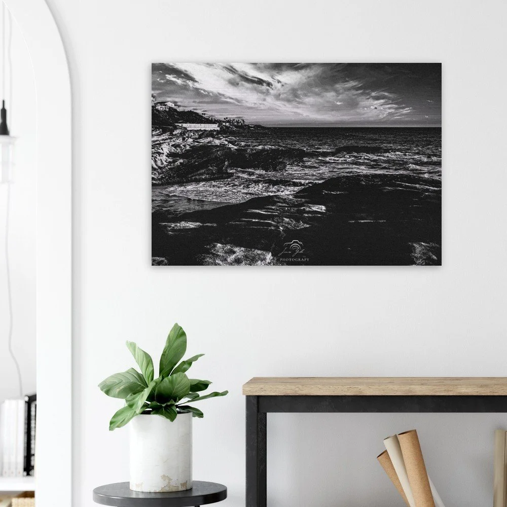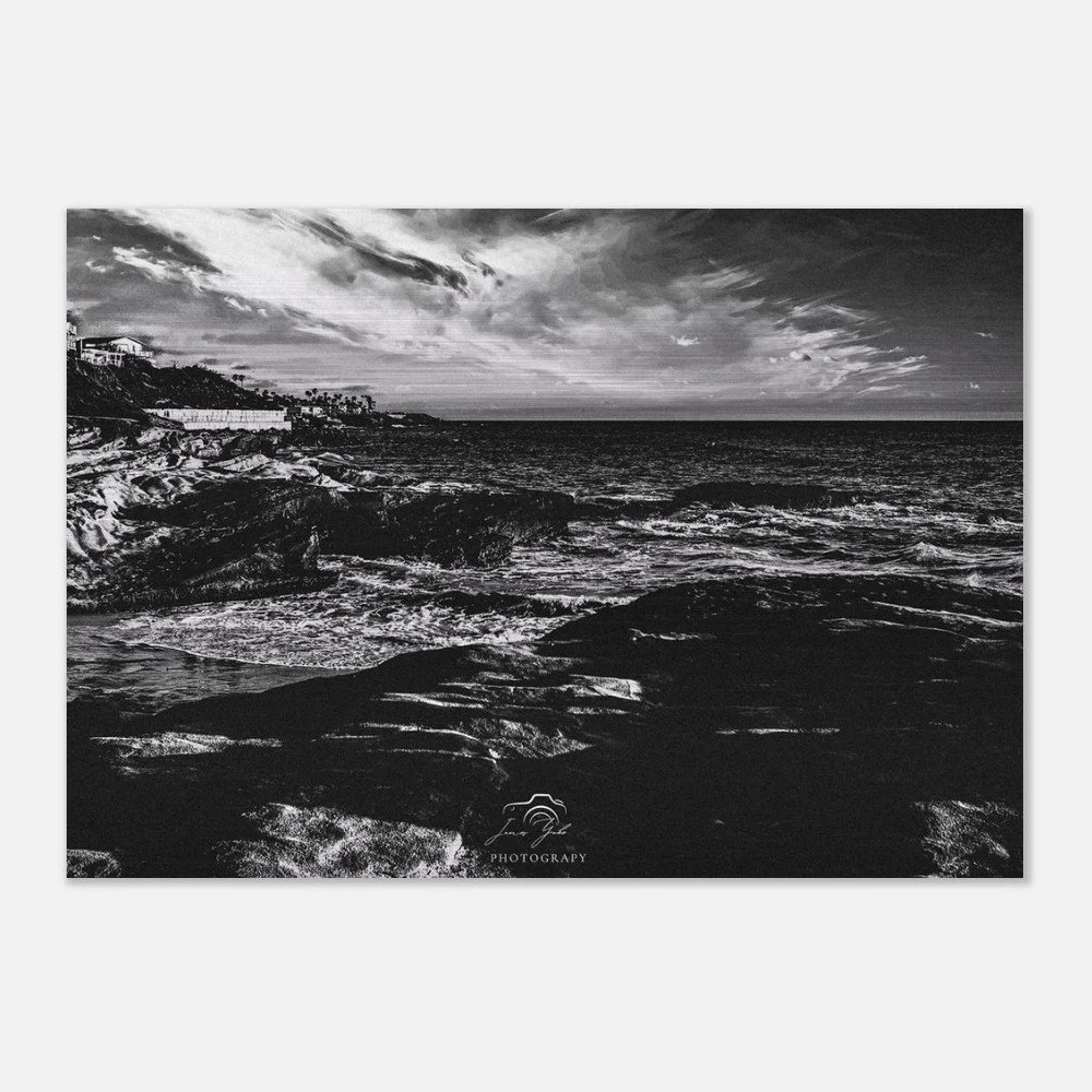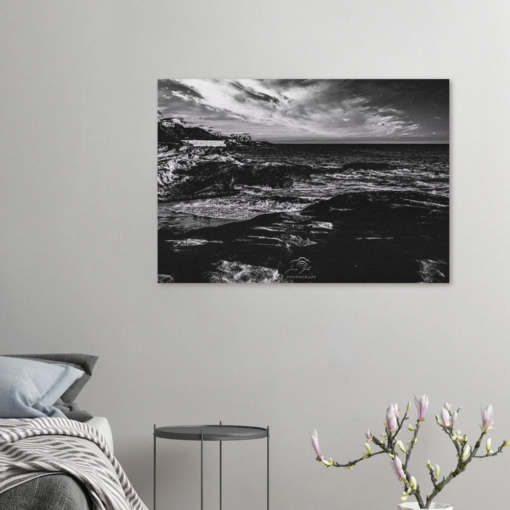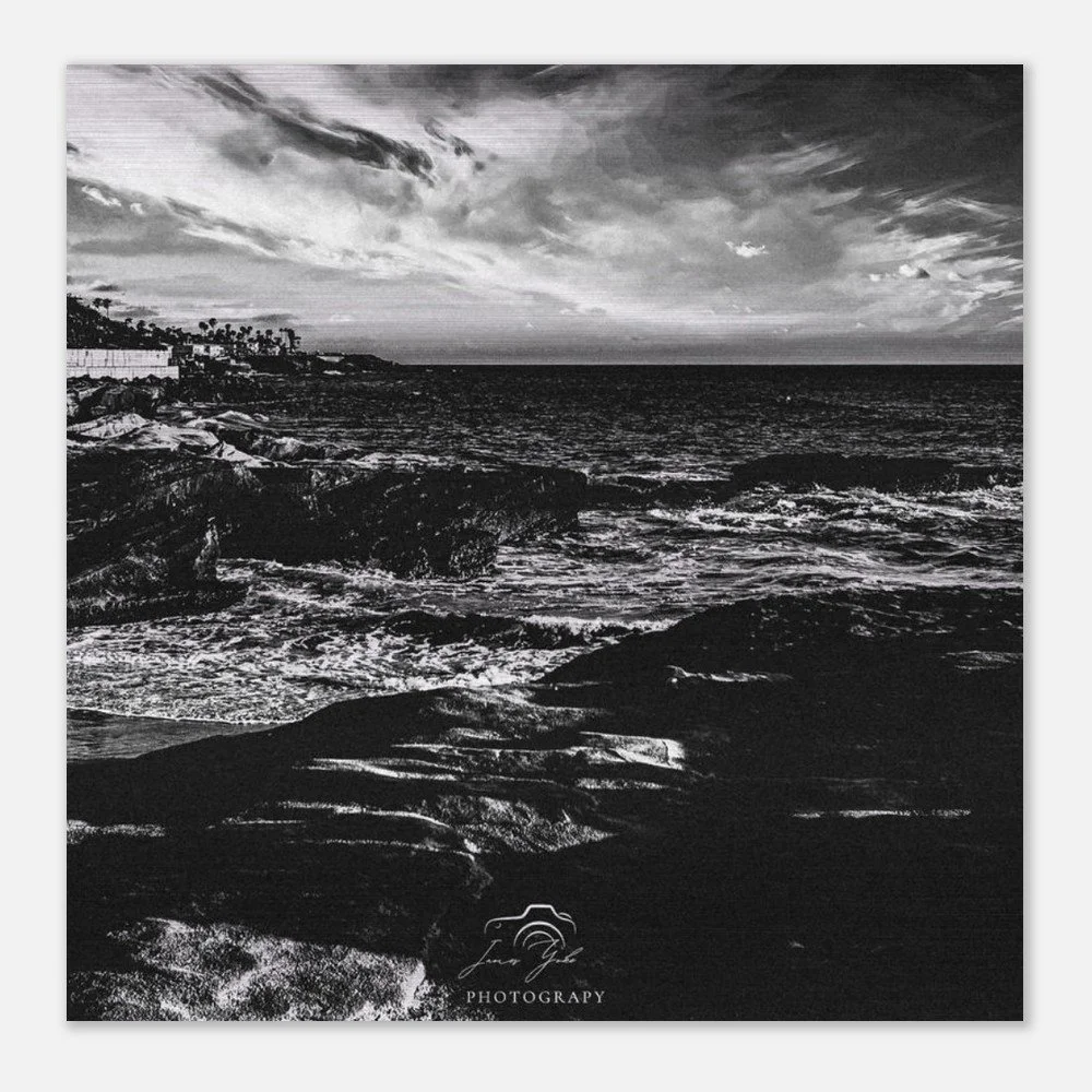 Elevate your space with timeless coastal elegance through this classic black & white Ocean Beach brushed metal print. Stripped of color, the image focuses on striking contrast, texture, and composition—highlighting the movement of the waves, the depth of the shoreline, and the dramatic interplay of light and shadow along the coast.