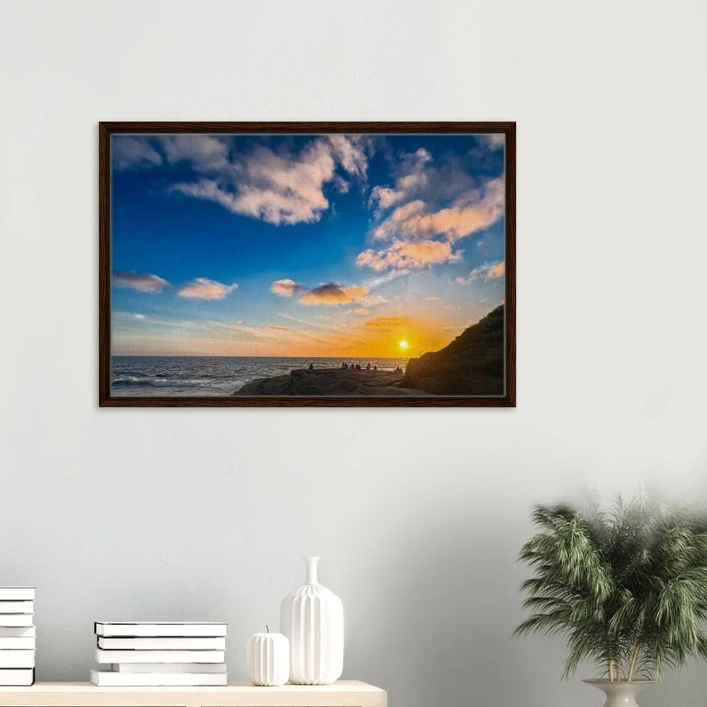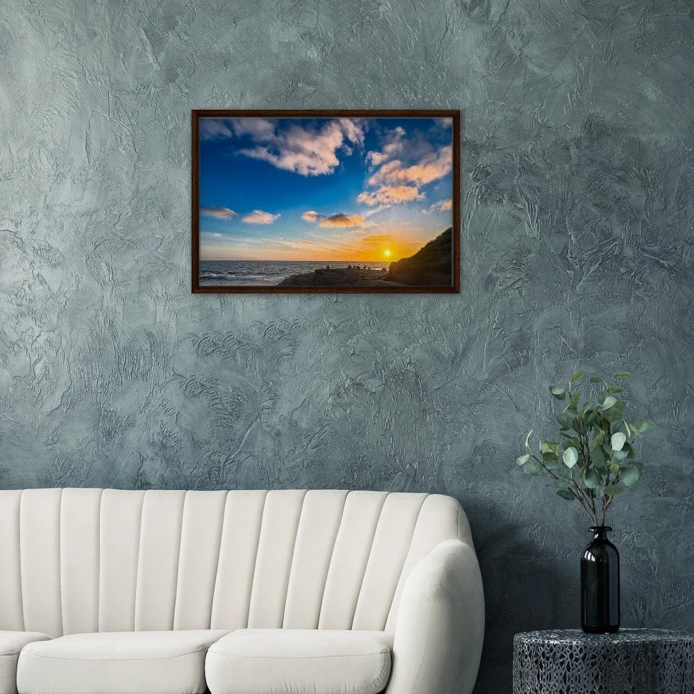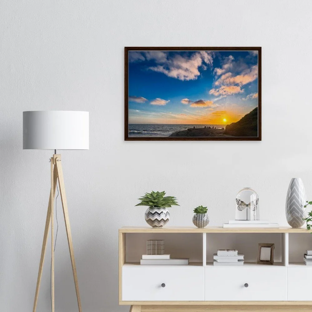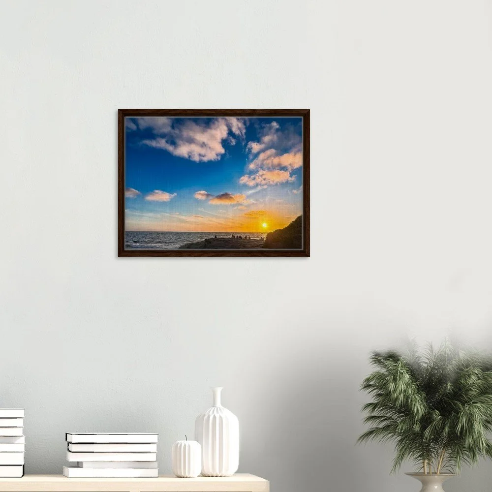Bring the warmth and glow of the California coast into your space with this Golden Ocean Beach Sunset framed canvas. Capturing the moment the sun melts into the horizon, this stunning image showcases rich golden tones reflecting across the ocean, with soft waves and a radiant sky creating a peaceful, dreamlike atmosphere.