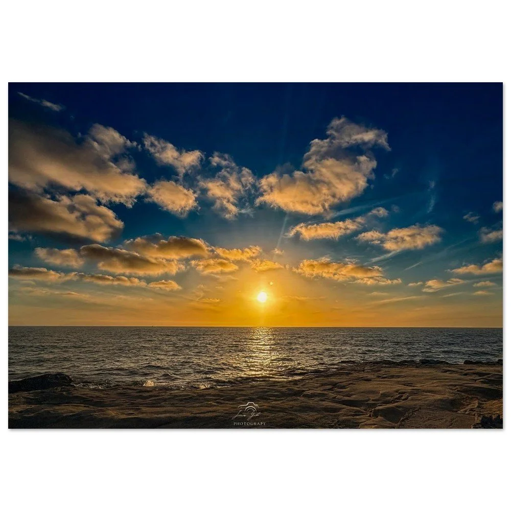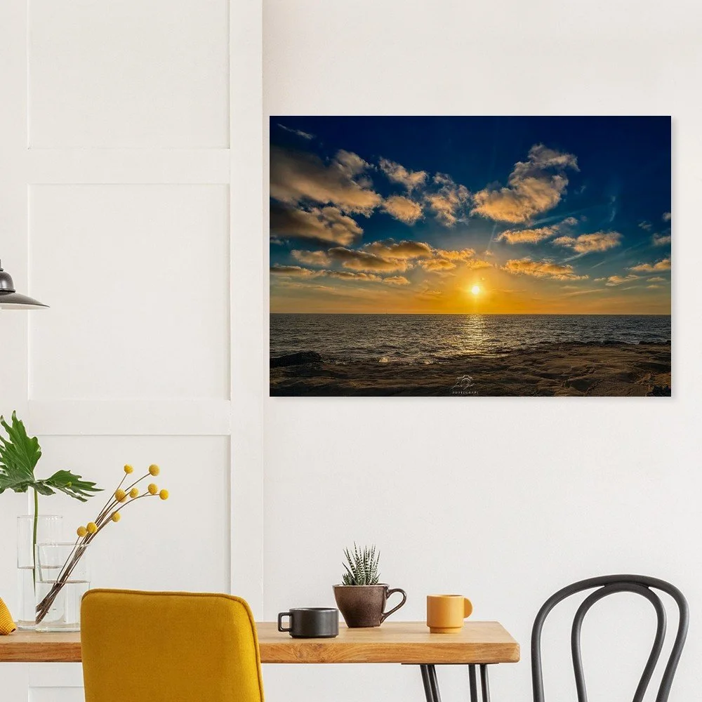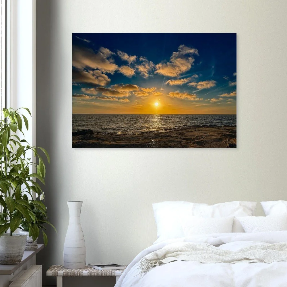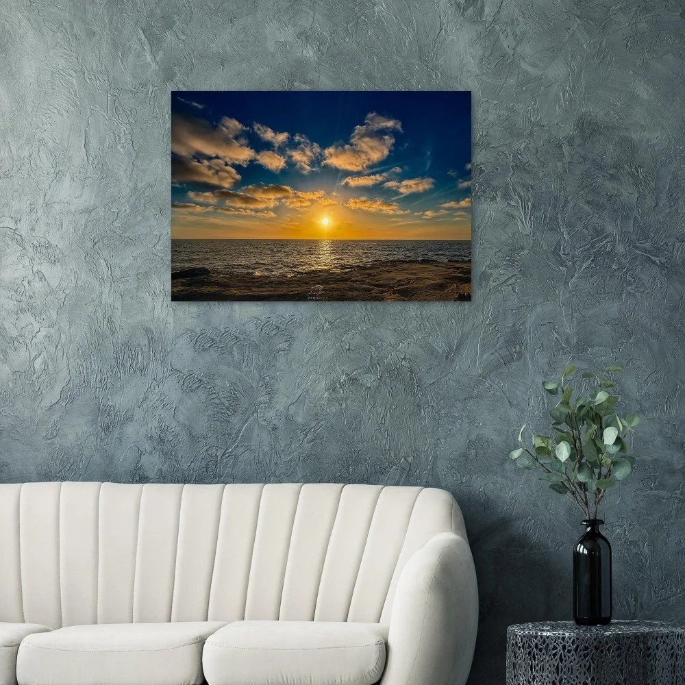 Bring the warmth of a California sunset into your space with this beautiful Ocean Beach sunset at the Santa Cruz Cliffs brushed wood print. Capturing the moment the sun sinks into the Pacific, the sky glows with rich tones of orange, pink, and gold, casting soft light across the rugged cliffs and rolling waves below.